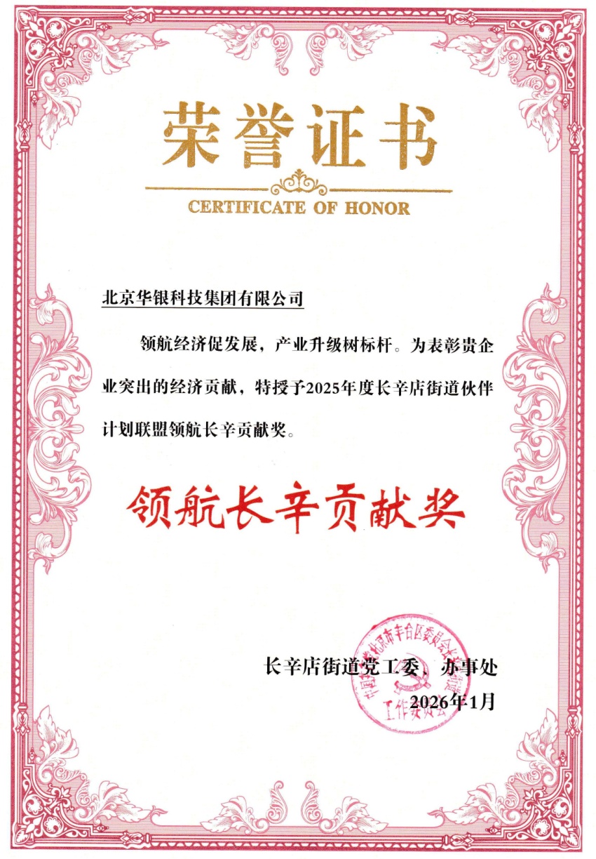 为表彰北京华银科技集团在领航经济促发展,产业升级树标杆等方面的突出贡献,北京丰台区长辛店街道党工委、办事处特授予集团2025年度长辛店街道伙伴计划联盟—领航长辛贡献奖!