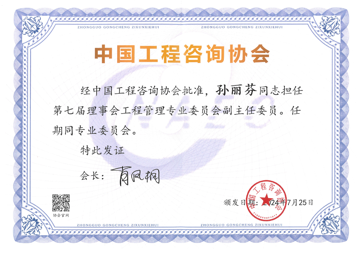 2025年10月22日,中国工程咨询协会第七届理事会工程专业委员会召开会议,正式公布任职名单并颁发证书,我集团董事长孙丽芬女士凭借在工程管理领域的深厚专业积淀与卓越行业贡献,成功当选为工程管理专业委员会副主任委员,任期与专业委员会同期。